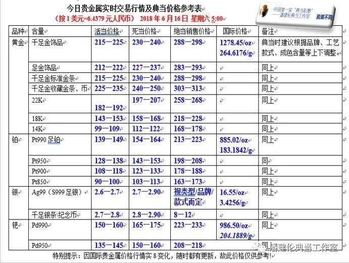 或许国际金价就是如此,截止到北京时间今天早上的5:00,国际贵金属(金银铂钯金)现货价格出现全线大跌,其中现货金价从昨天上午的1301.16美元跌倒今天的1278.45美元(按1美元=6.4379折算,约合人民币每克单价264.62元,详见本文附后的“今日贵金属实时交易行情及典当价格参考表”。),换算成人民币的价格倒是跌幅不大,但要注意到这里面有人民币对美元的贬值因素影响,总之,老潘我觉得,不到24小时跌这么多,可以说是大跌了,前天老潘还撰文说这一次美联储加息对金价无实质性影响,是延时影响?还是世界杯赛事的触发?或许还真的是有呢,您觉得呢?