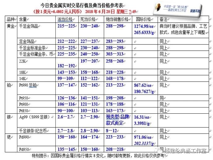 附今日贵金属实时交易行情及典当价格参考表:
