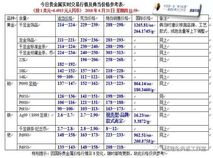 附今日贵金属实时交易行情及典当价格参考表: