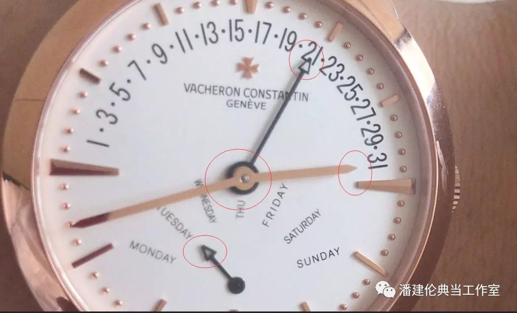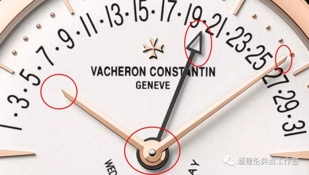 不管您怎们看,我的判断就是一个并不高明的仿品,而且仅上面一张正面图就可以说明问题,您或许会问我,从哪几个点看出来的呢?如果您看过老潘我几天前写的标题为《您知道手表外观鉴定法的十二个切入点吗?》的文章,想必您就知道该怎样从外观上去审视图中的这款江诗丹顿传承系列双飞返星期日历型表了。简单的说,就是您不妨在您的手机上将图片拉大,看看该手表的针轴针尖工艺,我想您定然是能给出如我一样的判断结论的,或许要照顾到咱们同仁同好中的一些新人吧,老潘我将该图片放大后剪切下来,如下图:
