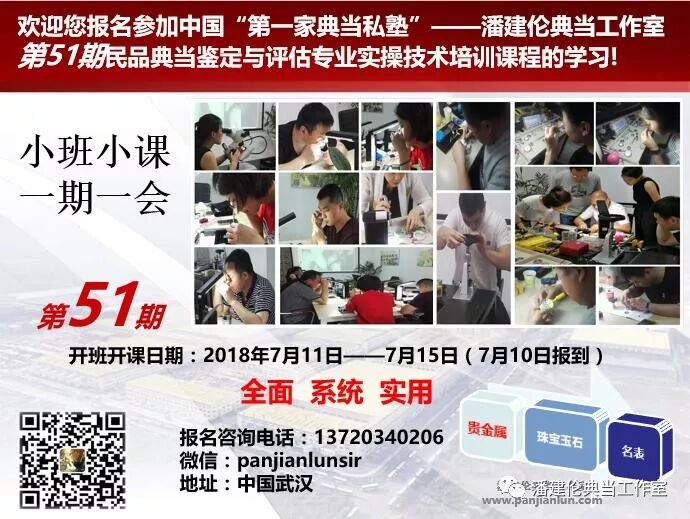 一天一点资讯,一天一点感悟,感谢您关注中国第一家“典当私塾”——潘建伦典当工作室!小班小课,一期一会,老潘的第51期民品典当鉴定与评估专业实操技术培训学习小班课程已拟定在7月11日至15日开班开课(7月10日报到),老潘在武汉随时欢迎您的垂询和预定,无论如何,老潘我始终认为,对于一个典当专业人来说,培训学习固然是终身的,但培训学习的方式方法却还是有讲究的,在一个碎片化的时代,用典当专业角度,用典当思维方式,把各类知识点打通,更全面系统化的将贵金属、珠宝玉石、名表及奢侈品等品类的典当鉴定与评估知识和技能一次学完到哪里去找都不会有,我不说是最好,说是最合适应该是没问题的,您说呢?我学习,我收获,我快乐!我进步!跟着我们的老潘一起终身学习吧!