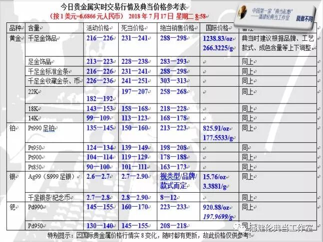 附今日国际贵金属实时交易行情及典当价格参考表: