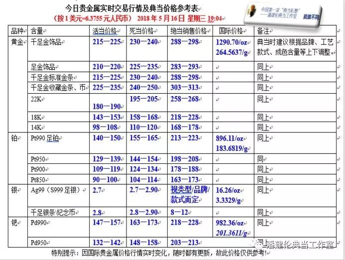 附今日国际贵金属实时交易行情及典当价格参考表: