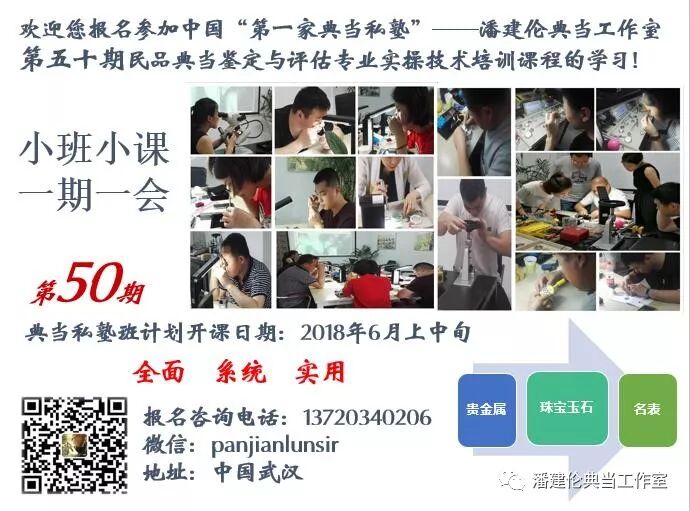 一天一点资讯,一天一点感悟,感谢您关注中国第一家“典当私塾”——潘建伦典当工作室!小班小课,一期一会,若是您有兴趣且没来得及报名参加这一期私塾班的培训学习的话,你可以联系老潘预定第50期典当私塾班课程(计划在2018年6月上中旬)。无论如何,老潘我始终认为,对于一个典当专业人来说,培训学习固然是终身的,但培训学习的方式却还是有讲究,有方法,用典当专业角度,用典当思维方式,更全面系统化的将贵金属、珠宝玉石、名表及奢侈品等品类的典当鉴定与评估知识和技能一次学完到哪里去找都不会有,不说是最好,说是最合适应该是没问题的,您说呢?我学习,我收获,我快乐!我进步!跟着我们的老潘一起终身学习吧!