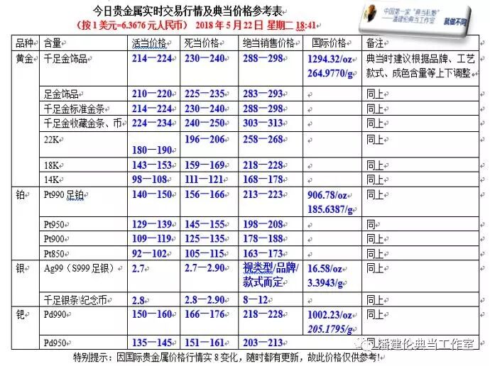 附今日贵金属现货实时交易行情及典当价格参考表: