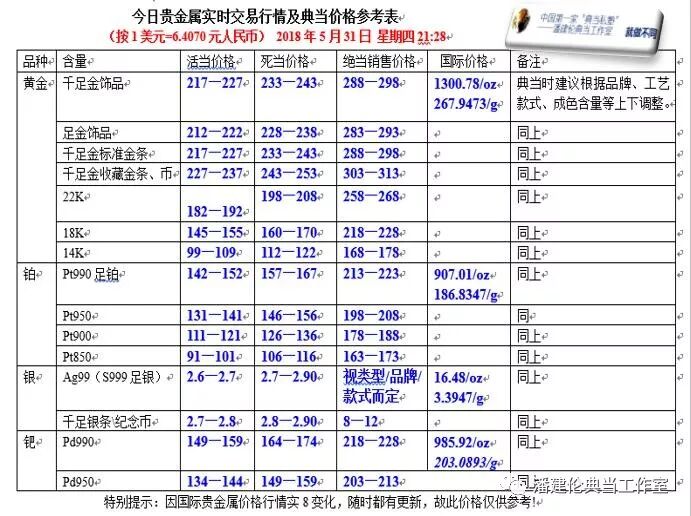 附今日贵金属实时交易行行情即典当价格参考表: