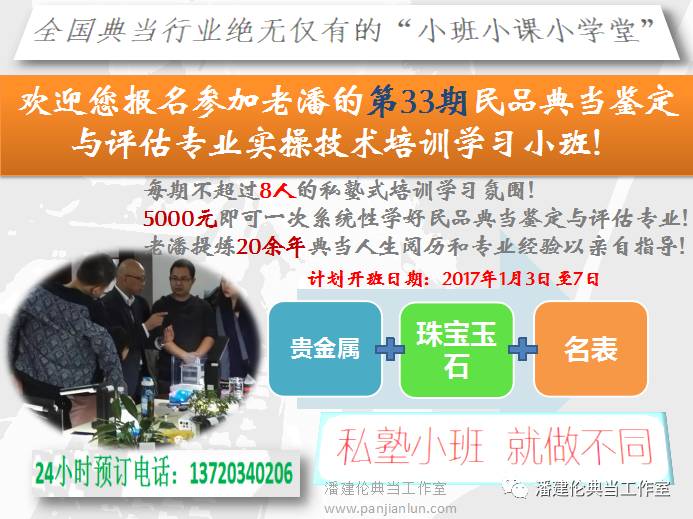 根据潘建伦典当工作室2017年1月工作计划及安排,全国典当行业首创的私塾式培训学习模式暨“第33期民品典当鉴定与评估专业实操技术培训学习小班”计划于2017年1月3日至1月7日开班授课(1月2日报到),即日起欢迎全国典当行业中有学习兴趣的典当同仁或行业外诸如寄卖行、拍卖行、奢侈品商、名品店等人士预定;民品典当鉴定与评估实操培训学习小班在武汉潘建伦典当工作室举办,每期学习五天,为保证学习效果,每次的培训学习人数控制在不超过8人,培训学习的主要内容为民品典当业务产品中黄金典当鉴定与评估、铂金典当鉴定与评估、钯金典当鉴定与评估、银饰品典当鉴定与评估、K金典当鉴定与评估、钻石典当鉴定与评估、名贵彩色宝石的典当鉴定与评估、翡翠典当鉴定与评估、和田玉典当鉴定与评估、名表典当鉴定与评估等多个品类的典当鉴定与评估技术进行系统性培训指导;